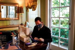 Nickolaus Brown, president of Motion Picture Costumers IATSE Local 705, makes face masks at his home in Hollywood.